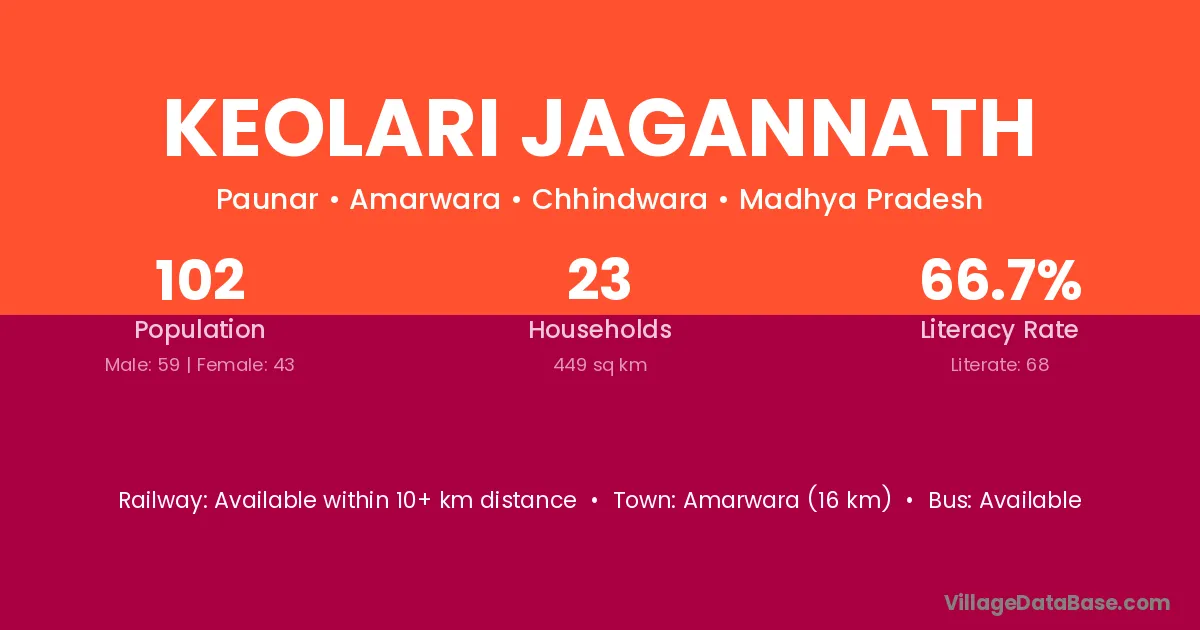 Amarwara (16 km) is the nearest town to Keolari Jagannath village for major economic activities and is located approximately 16 km away.