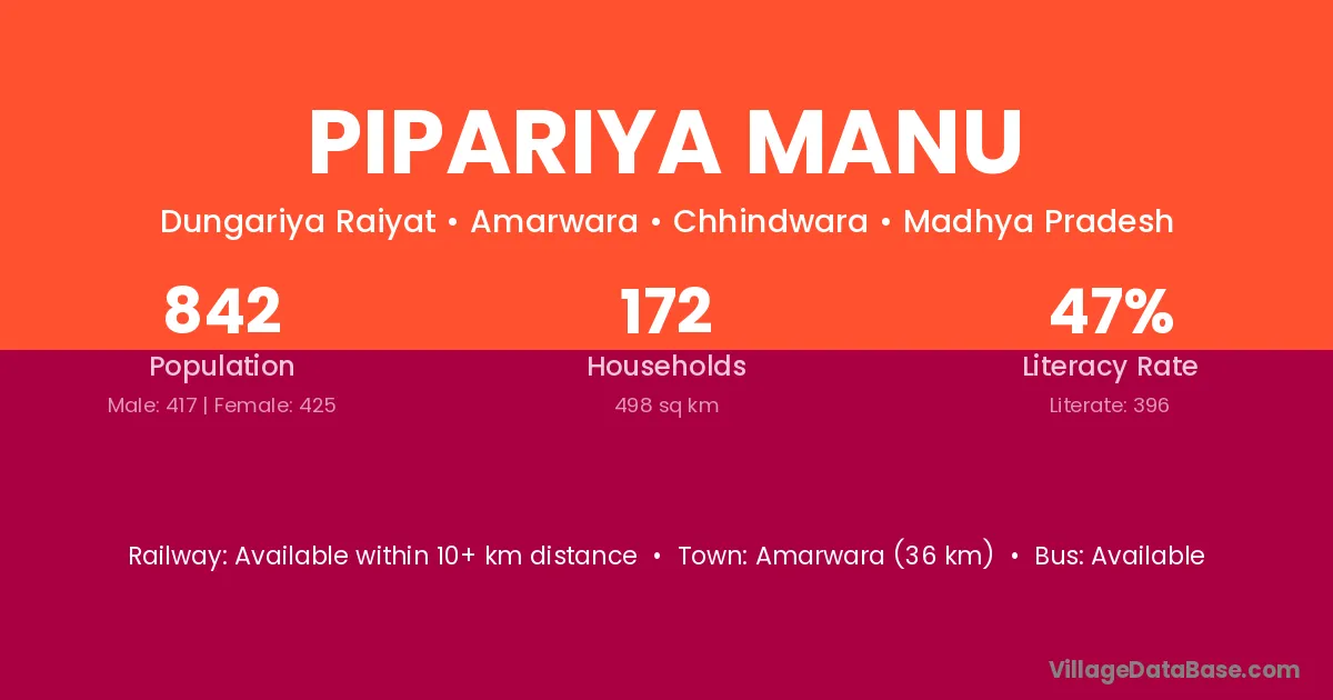 Amarwara (36 km) is the nearest town to Pipariya Manu village for major economic activities and is located approximately 36 km away.