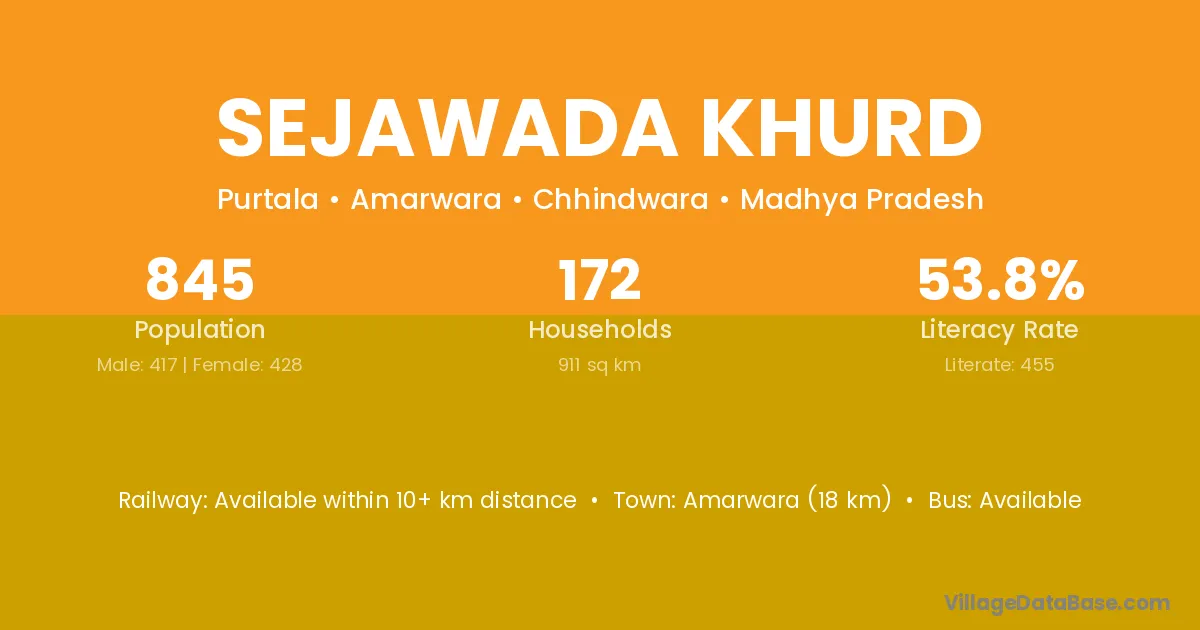 Amarwara (18 km) is the nearest town to Sejawada Khurd village for major economic activities and is located approximately 18 km away.