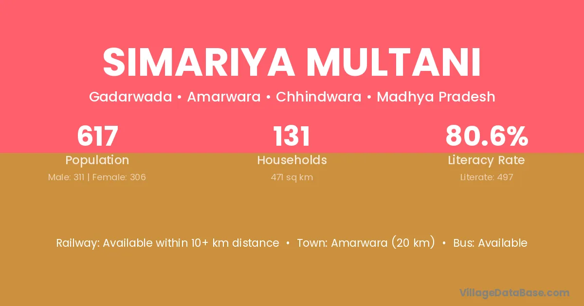 Amarwara (20 km) is the nearest town to Simariya Multani village for major economic activities and is located approximately 20 km away.
