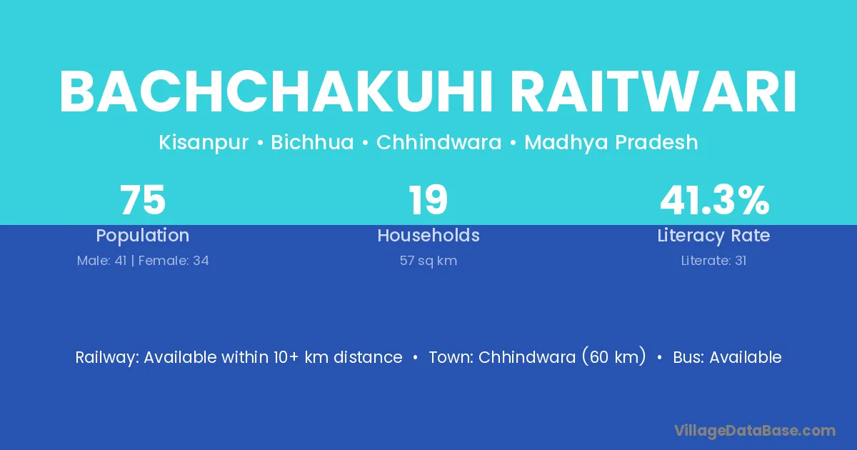 Chhindwara (60 km) is the nearest town to Bachchakuhi Raitwari village for major economic activities and is located approximately 60 km away.