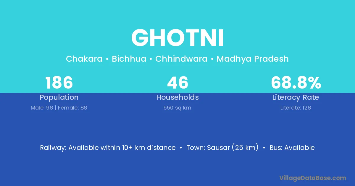 Sausar (25 km) is the nearest town to Ghotni village for major economic activities and is located approximately 25 km away.