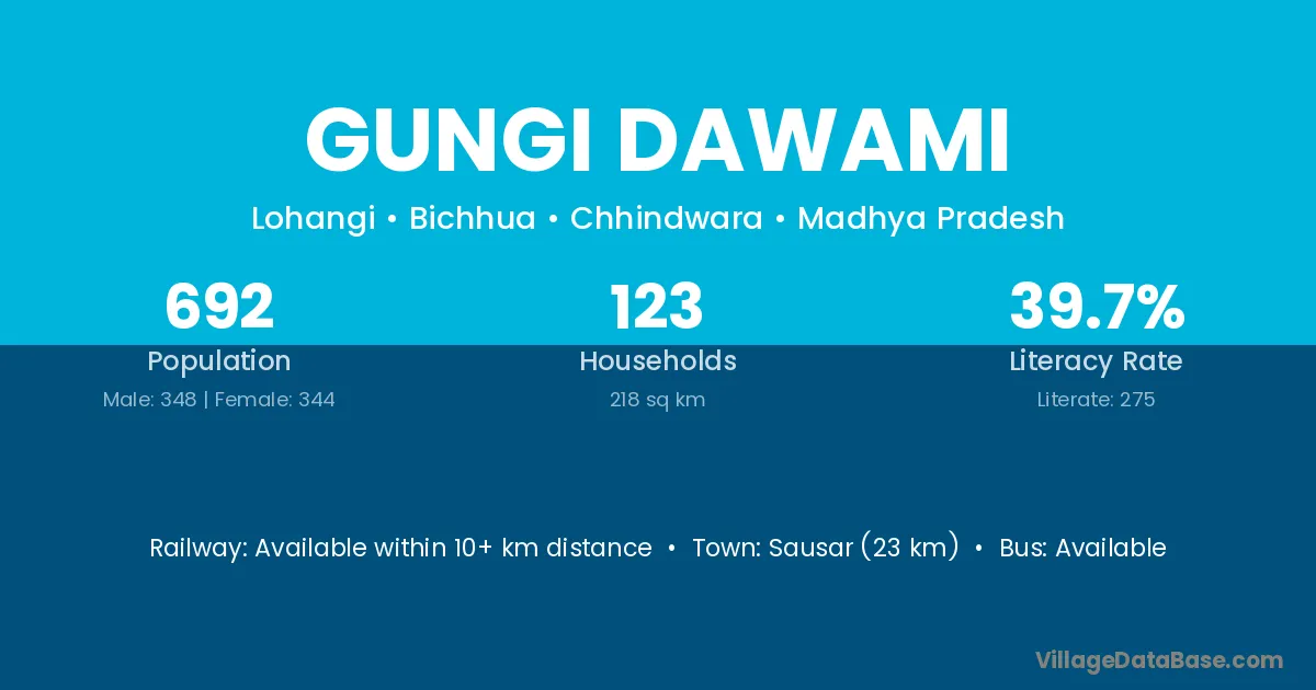 Sausar (23 km) is the nearest town to Gungi Dawami village for major economic activities and is located approximately 23 km away.