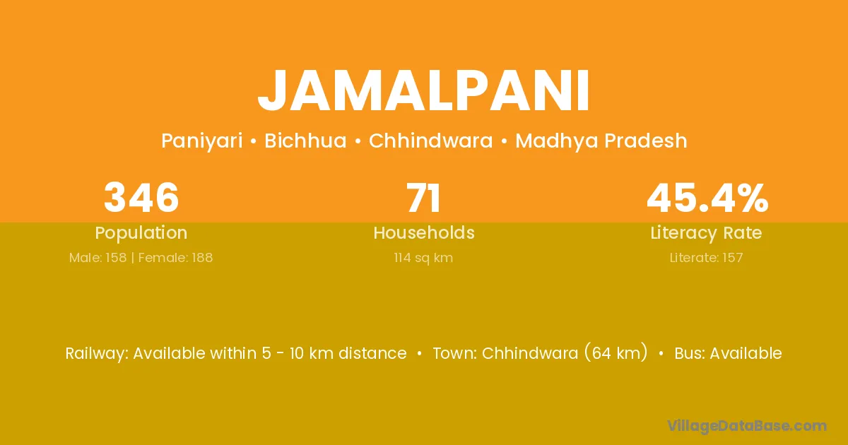Chhindwara (64 km) is the nearest town to Jamalpani village for major economic activities and is located approximately 64 km away.