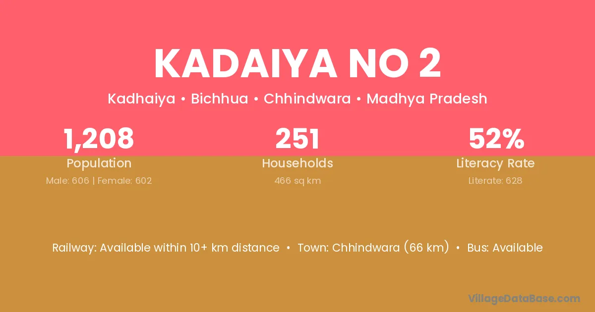 Chhindwara (66 km) is the nearest town to Kadaiya No 2 village for major economic activities and is located approximately 66 km away.