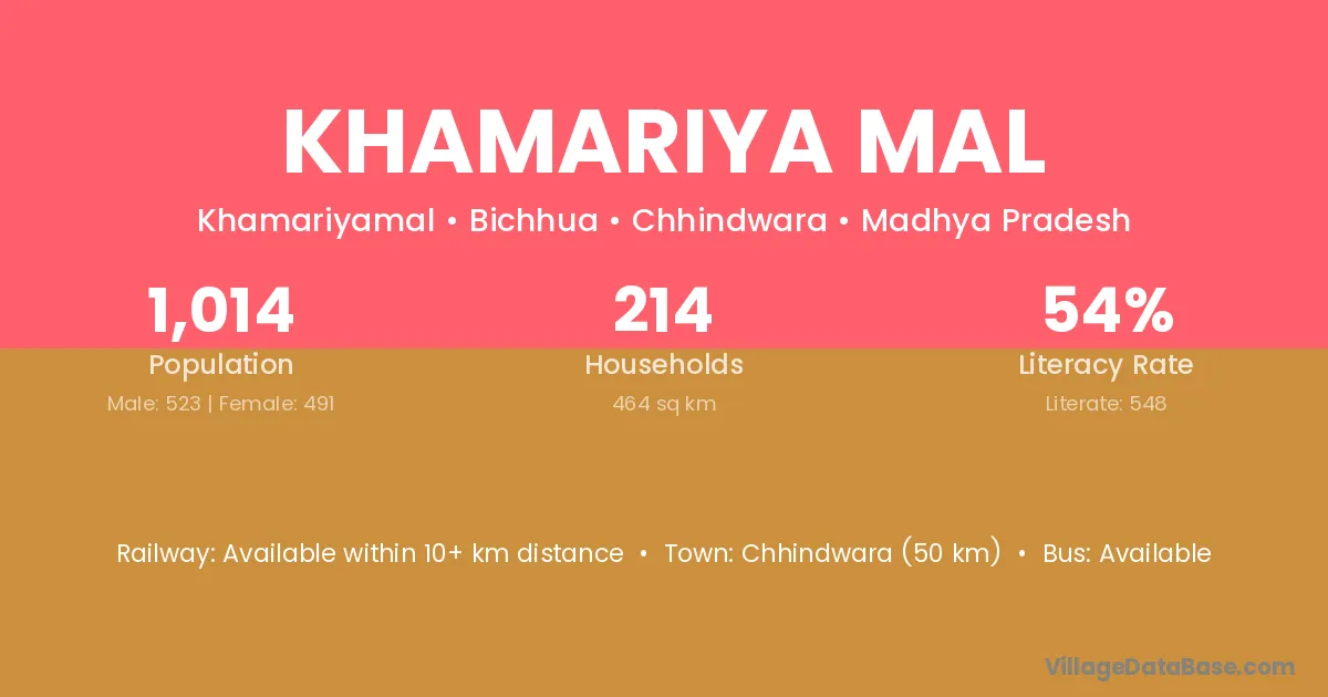 Chhindwara (50 km) is the nearest town to Khamariya Mal village for major economic activities and is located approximately 50 km away.