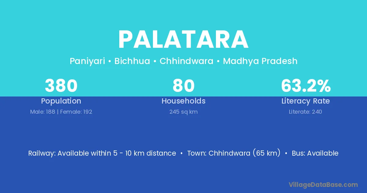 Chhindwara (65 km) is the nearest town to Palatara village for major economic activities and is located approximately 65 km away.