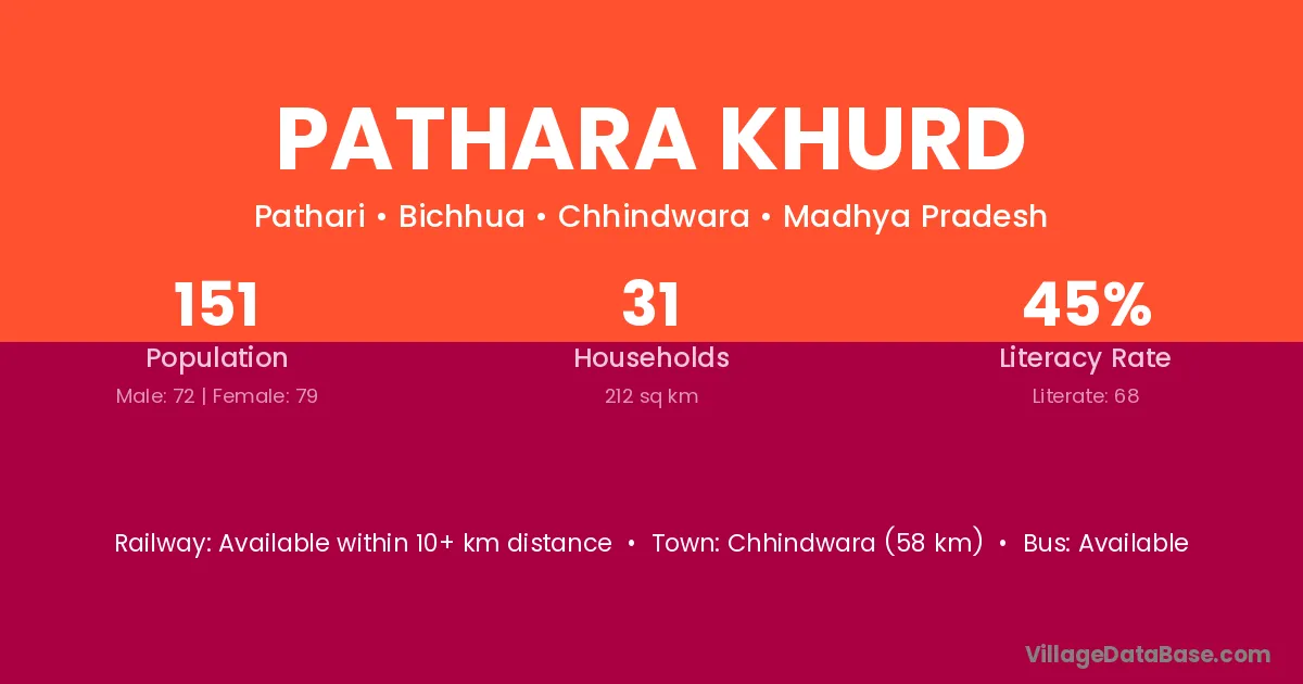 Chhindwara (58 km) is the nearest town to Pathara Khurd village for major economic activities and is located approximately 58 km away.