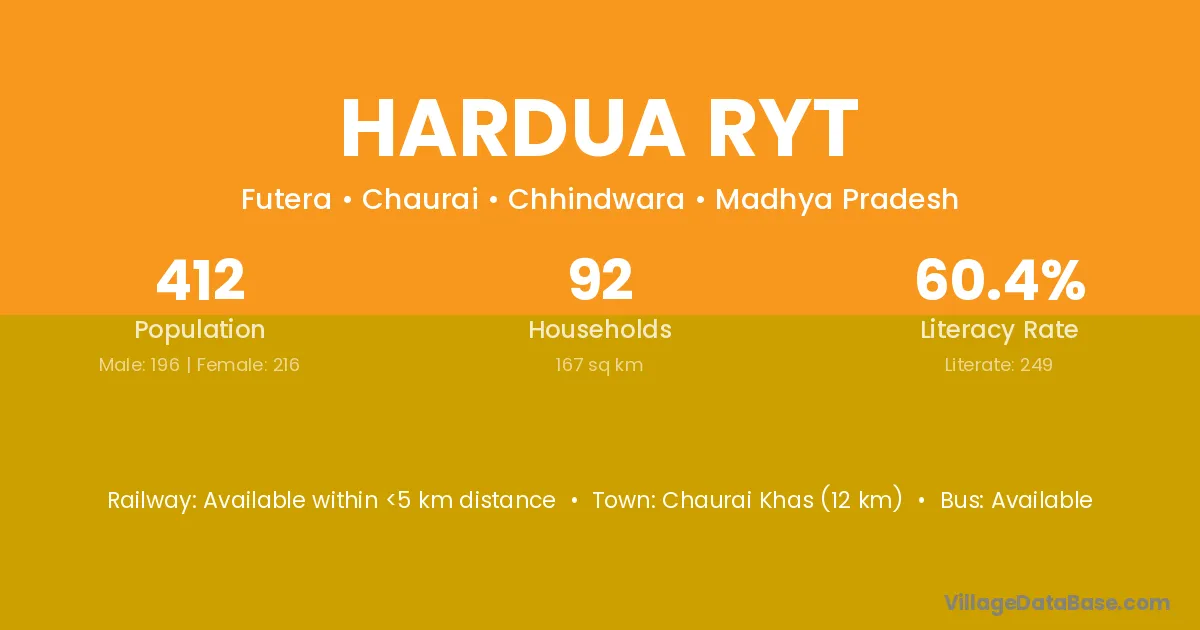 Hardua Ryt village has a total population of 412 people, of which 196 are males and 216 are females.