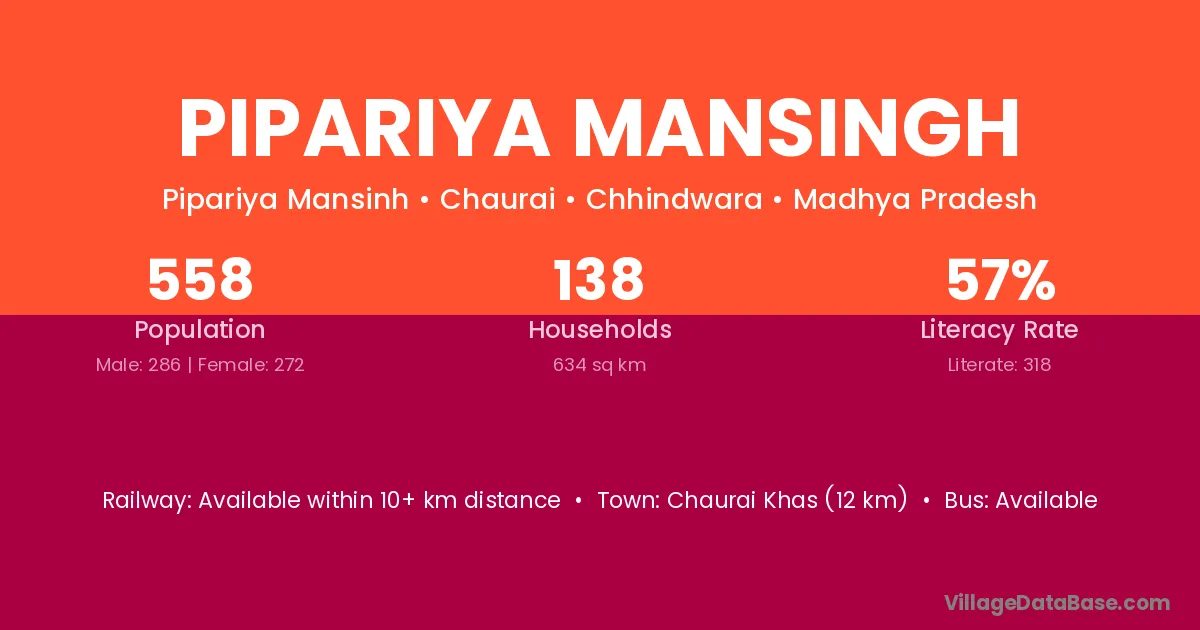 Chaurai Khas (12 km) is the nearest town to Pipariya Mansingh village for major economic activities and is located approximately 12 km away.