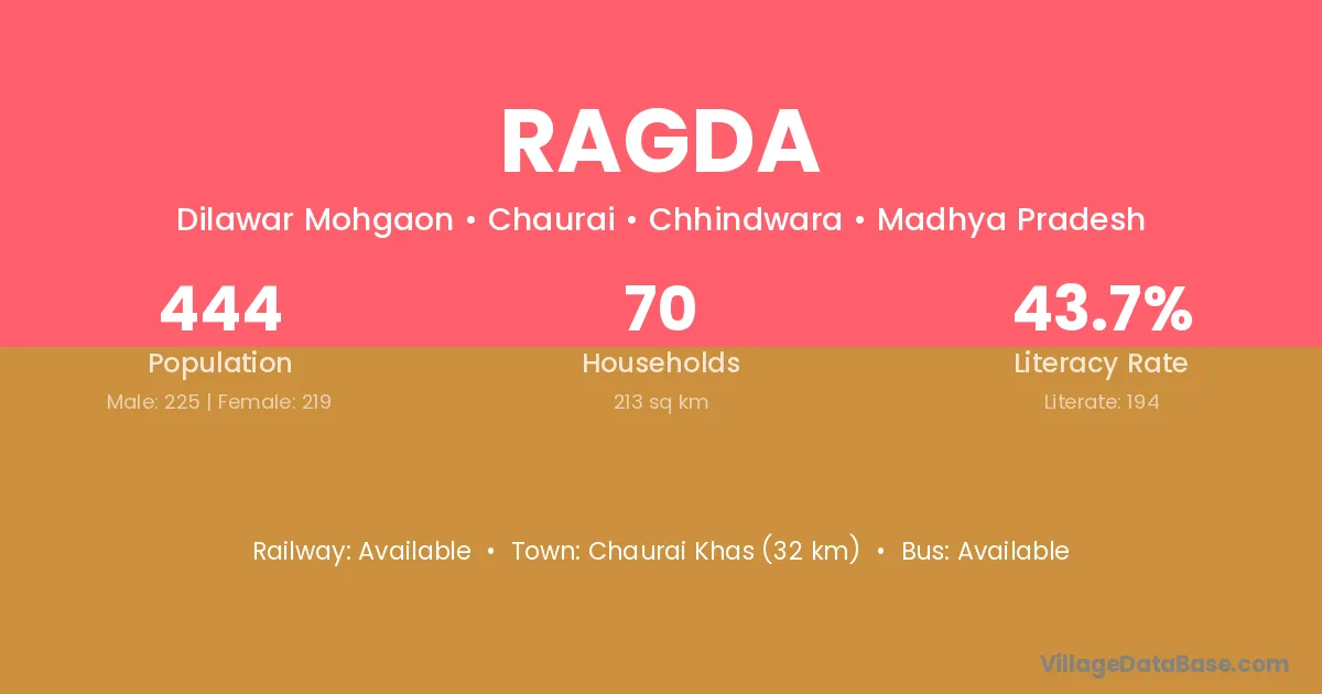 Ragda village has a total population of 444 people, of which 225 are males and 219 are females.