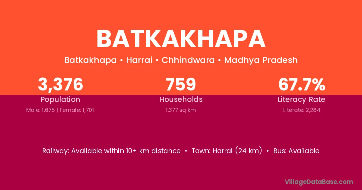 Batkakhapa village has a total population of 3,376 people, of which 1,675 are males and 1,701 are females.
