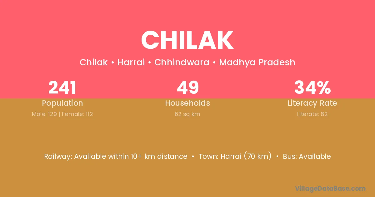 Chilak village has a total population of 241 people, of which 129 are males and 112 are females.