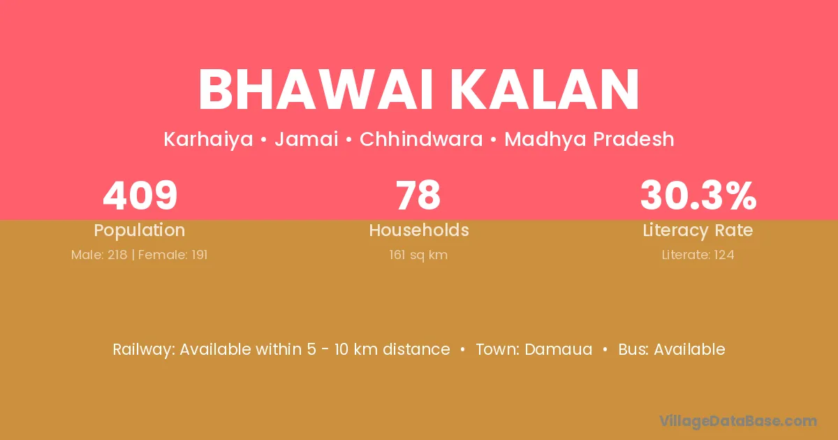 Bhawai Kalan village has a total population of 409 people, of which 218 are males and 191 are females.