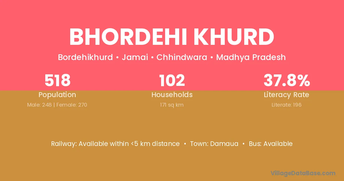 Bhordehi Khurd village has a total population of 518 people, of which 248 are males and 270 are females.