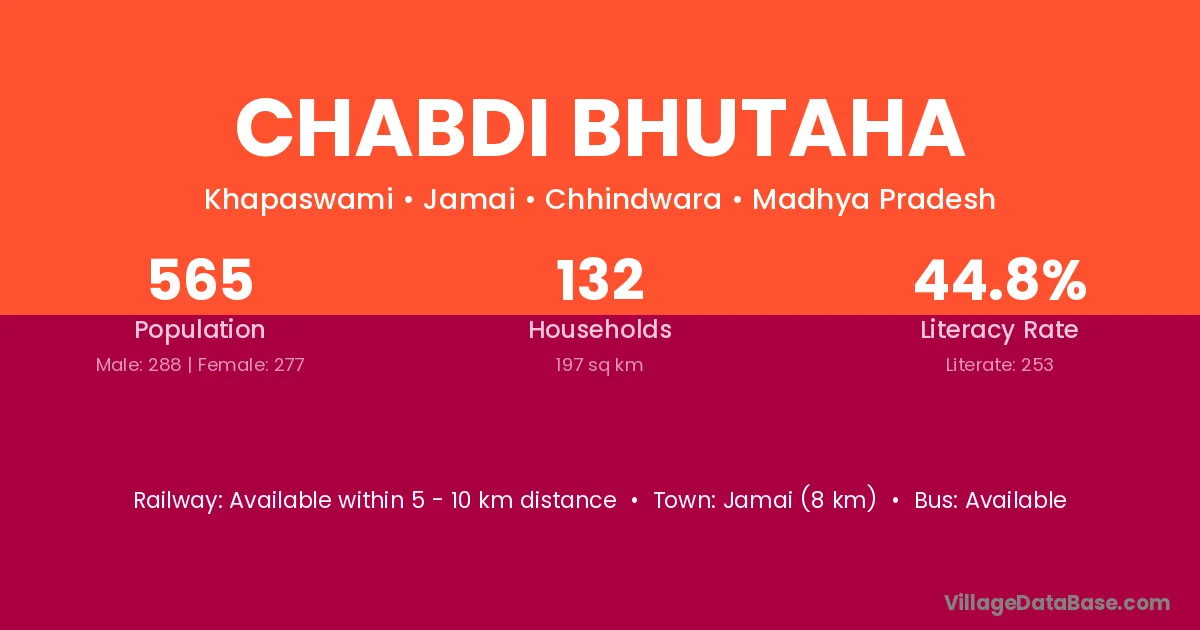 Chabdi Bhutaha village has a total population of 565 people, of which 288 are males and 277 are females.