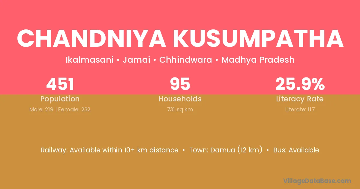 Chandniya Kusumpatha village has a total population of 451 people, of which 219 are males and 232 are females.