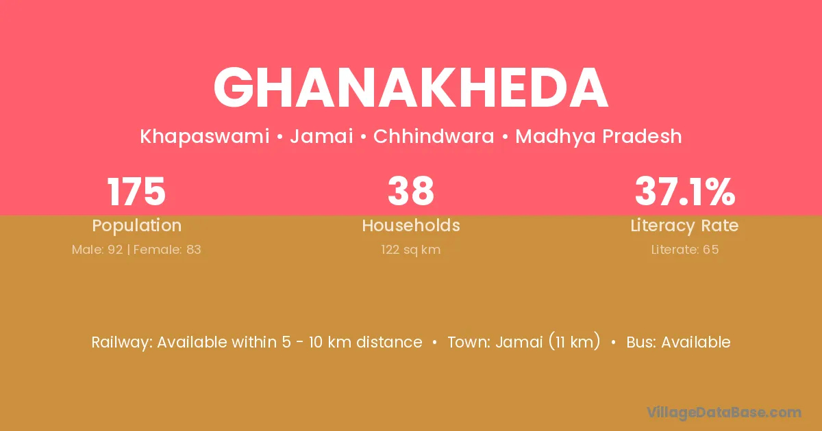 Jamai (11 km) is the nearest town to Ghanakheda village for major economic activities and is located approximately 11 km away.