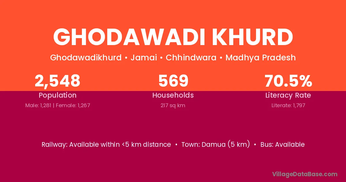 Damua (5 km) is the nearest town to Ghodawadi Khurd village for major economic activities and is located approximately 5 km away.