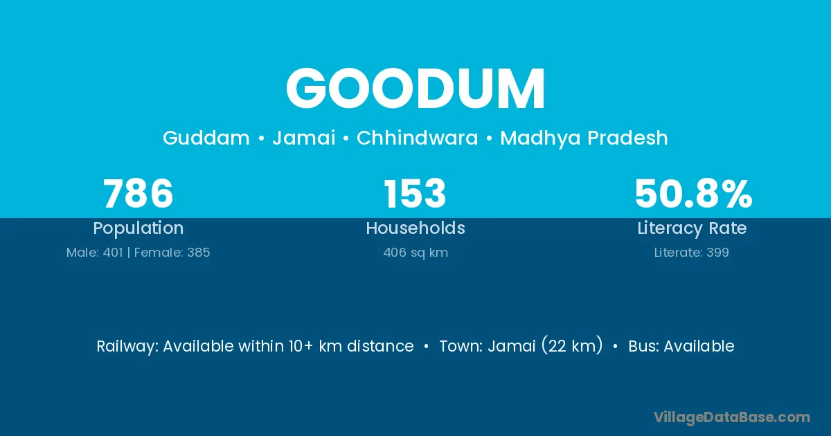 Goodum village has a total population of 786 people, of which 401 are males and 385 are females.