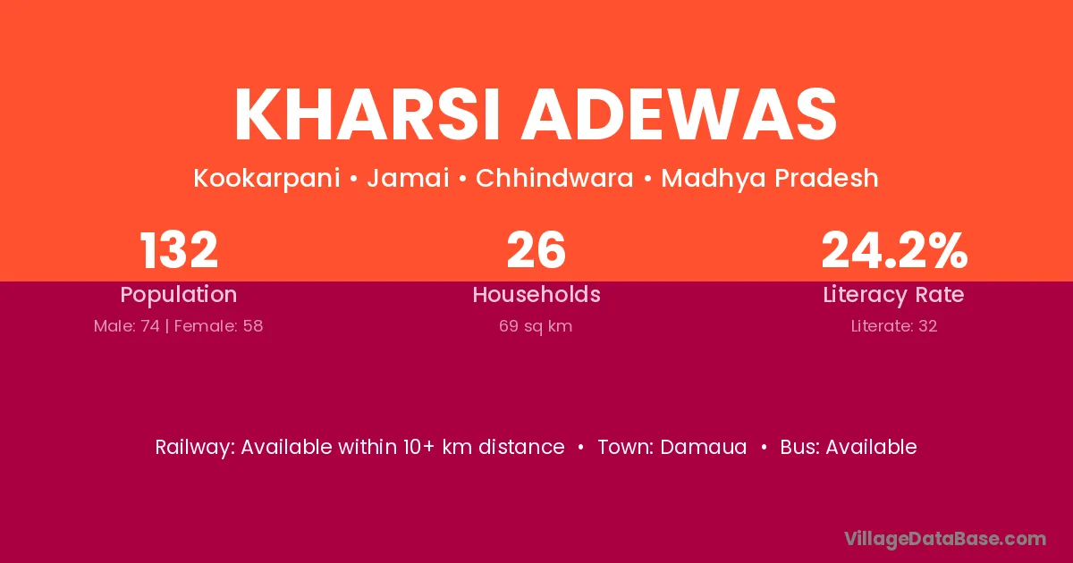 Kharsi Adewas village has a total population of 132 people, of which 74 are males and 58 are females.