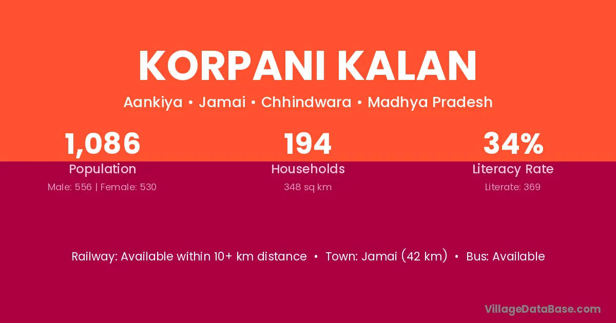 Jamai (42 km) is the nearest town to Korpani Kalan village for major economic activities and is located approximately 42 km away.