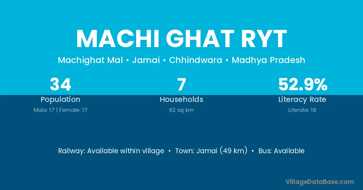 Machi Ghat Ryt village has a total population of 34 people, of which 17 are males and 17 are females.