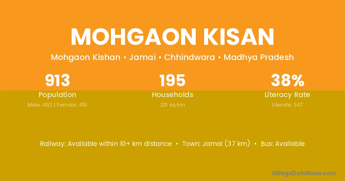 Mohgaon Kisan village has a total population of 913 people, of which 462 are males and 451 are females.