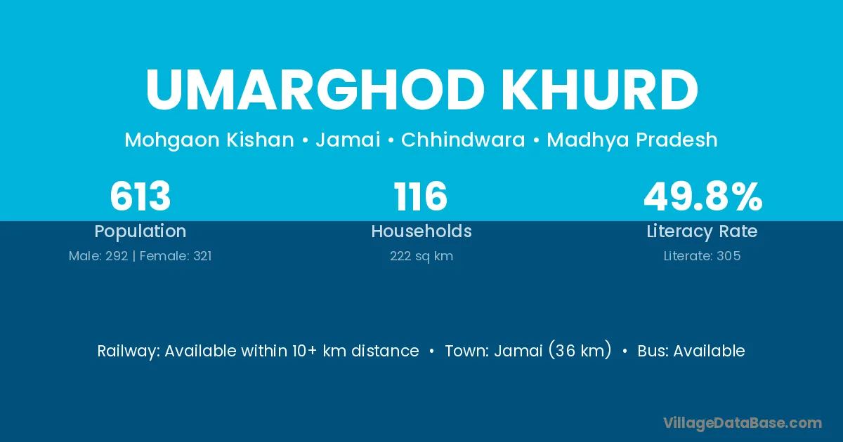 Umarghod Khurd village has a total population of 613 people, of which 292 are males and 321 are females.