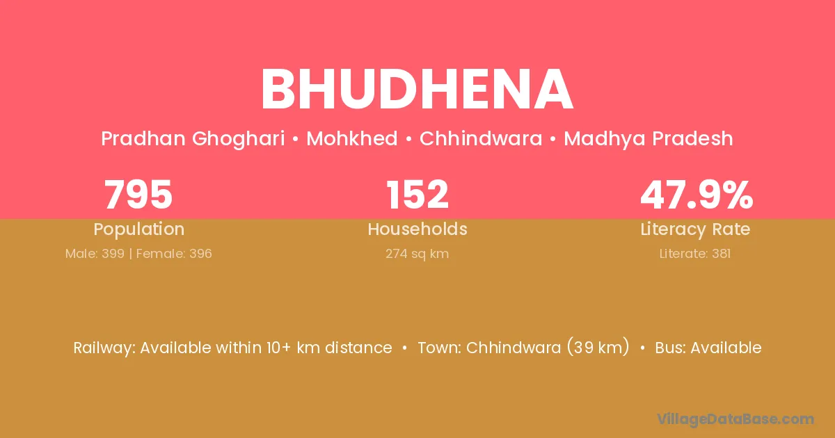 Chhindwara (39 km) is the nearest town to Bhudhena village for major economic activities and is located approximately 39 km away.