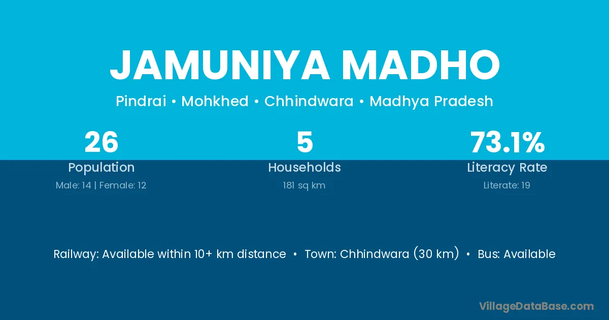 Chhindwara (30 km) is the nearest town to Jamuniya Madho village for major economic activities and is located approximately 30 km away.