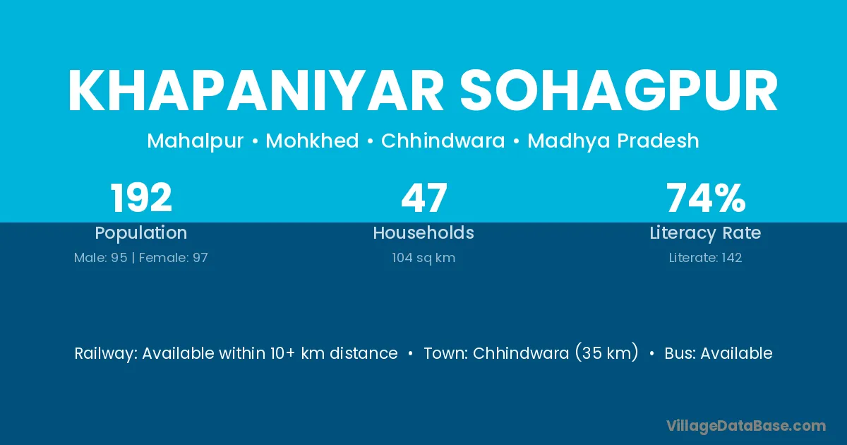 Chhindwara (35 km) is the nearest town to Khapaniyar Sohagpur village for major economic activities and is located approximately 35 km away.