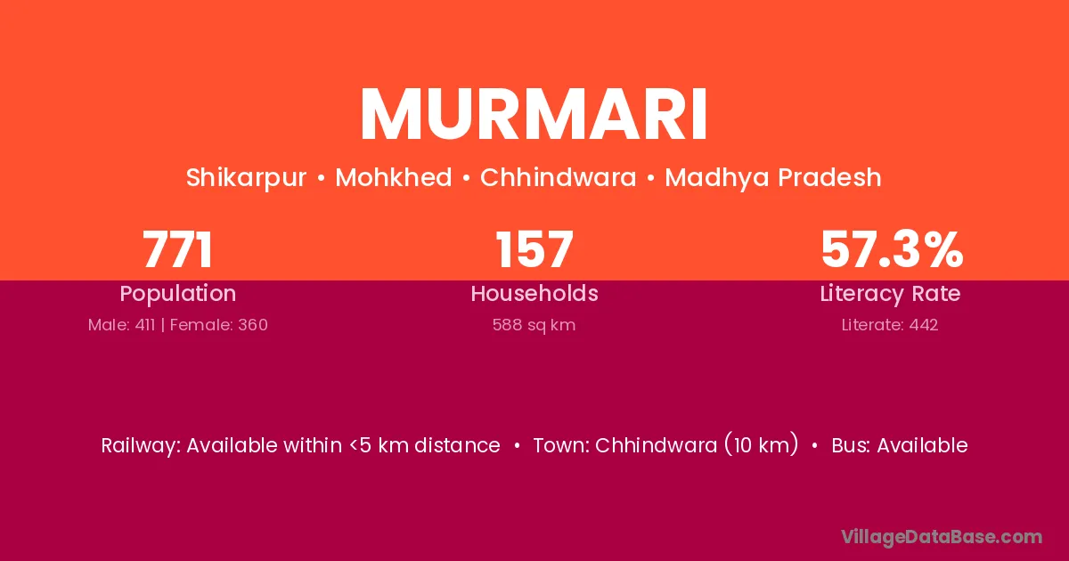 Chhindwara (10 km) is the nearest town to Murmari village for major economic activities and is located approximately 10 km away.