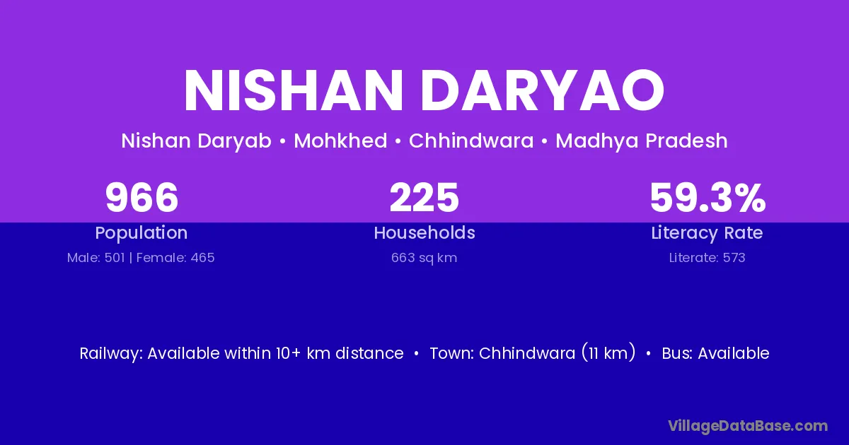 Chhindwara (11 km) is the nearest town to Nishan Daryao village for major economic activities and is located approximately 11 km away.