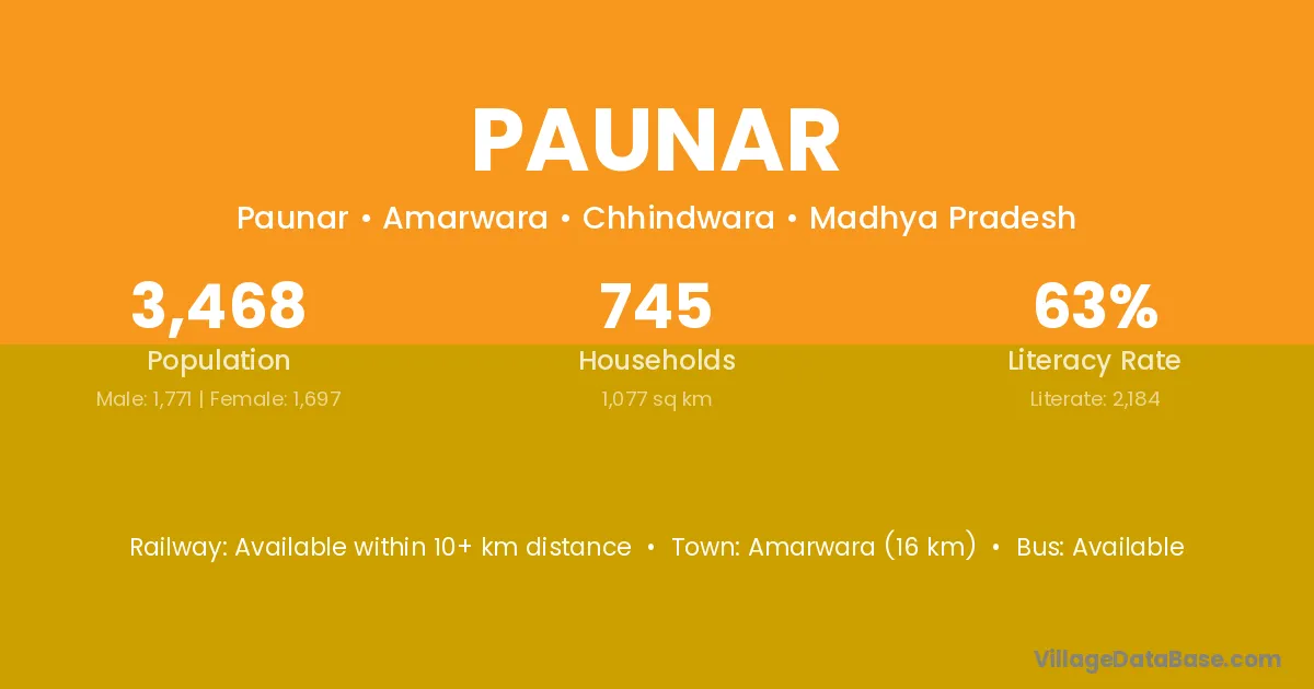 Chhindwara (30 km) is the nearest town to Paunar village for major economic activities and is located approximately 30 km away.