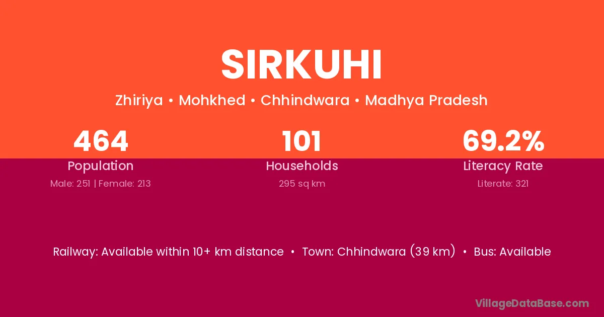 Chhindwara (39 km) is the nearest town to Sirkuhi village for major economic activities and is located approximately 39 km away.