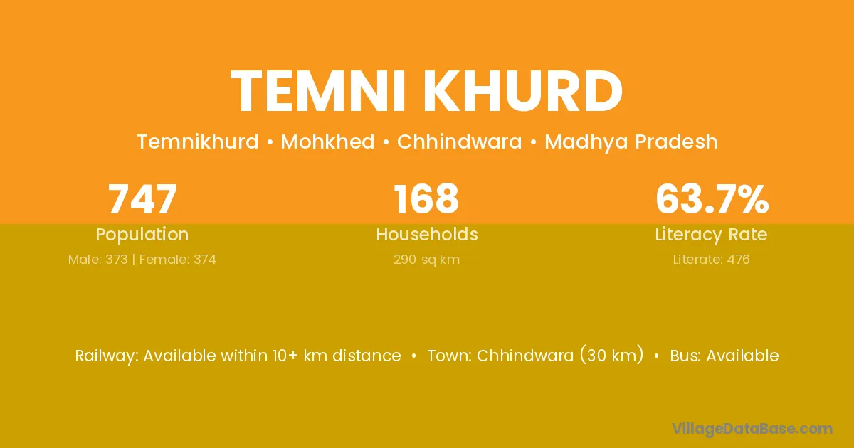 Chhindwara (30 km) is the nearest town to Temni Khurd village for major economic activities and is located approximately 30 km away.