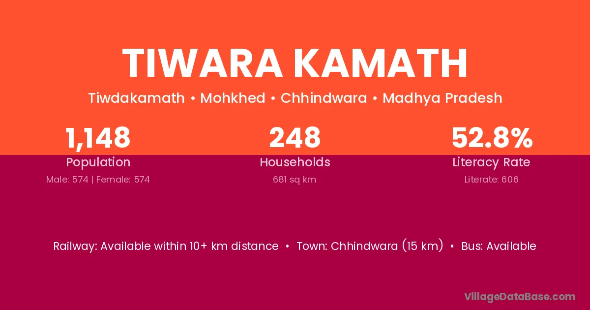 Chhindwara (15 km) is the nearest town to Tiwara Kamath village for major economic activities and is located approximately 15 km away.