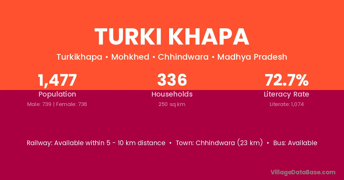 Chhindwara (23 km) is the nearest town to Turki Khapa village for major economic activities and is located approximately 23 km away.