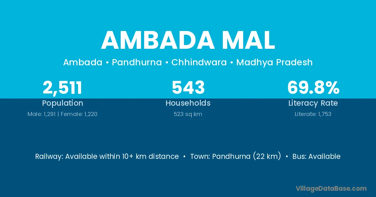 Ambada Mal village has a total population of 2,511 people, of which 1,291 are males and 1,220 are females.