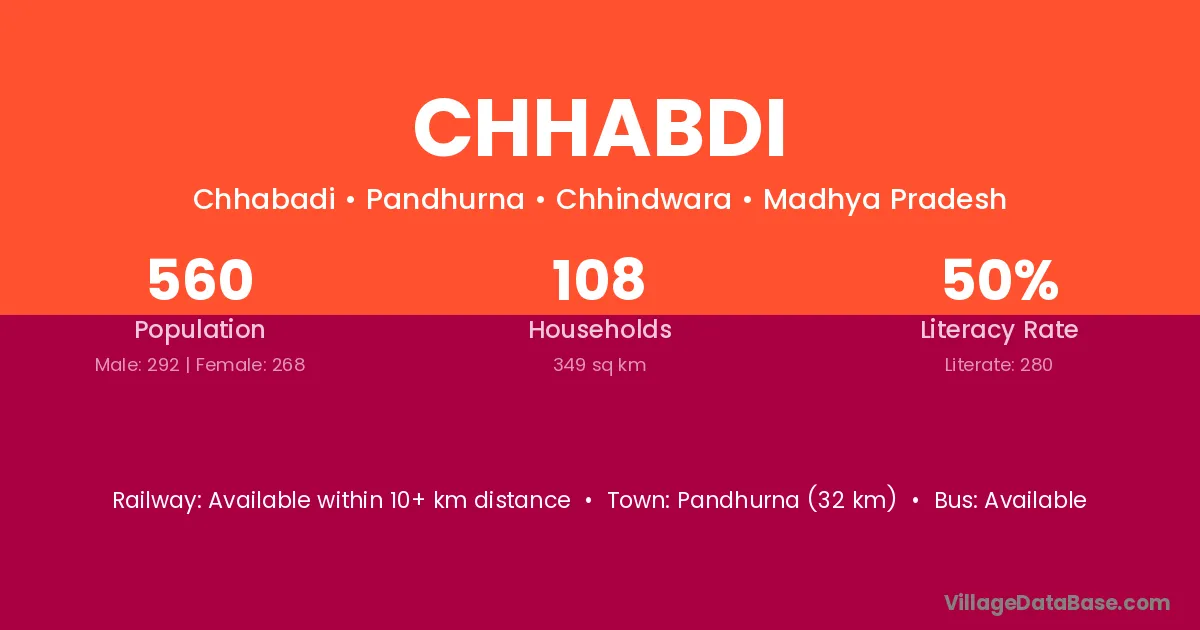 Pandhurna (32 km) is the nearest town to Chhabdi village for major economic activities and is located approximately 32 km away.