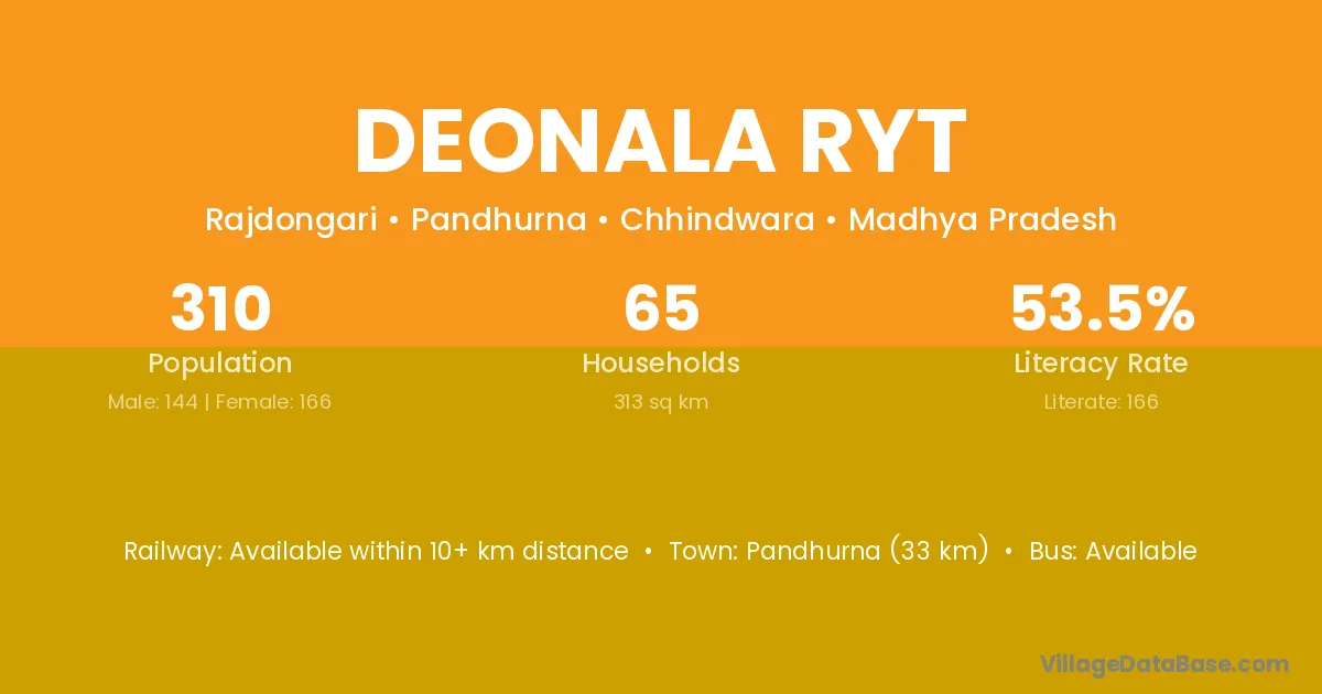 Pandhurna (33 km) is the nearest town to Deonala Ryt village for major economic activities and is located approximately 33 km away.