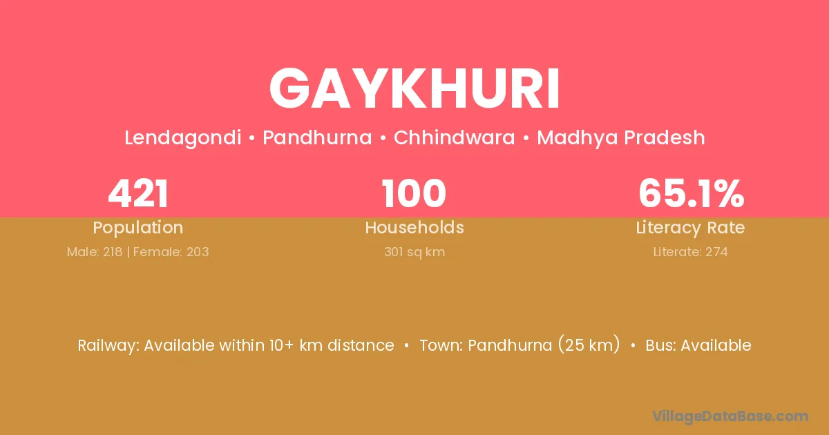 Pandhurna (25 km) is the nearest town to Gaykhuri village for major economic activities and is located approximately 25 km away.