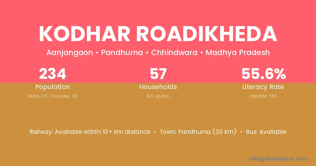 Pandhurna (30 km) is the nearest town to Kodhar Roadikheda village for major economic activities and is located approximately 30 km away.