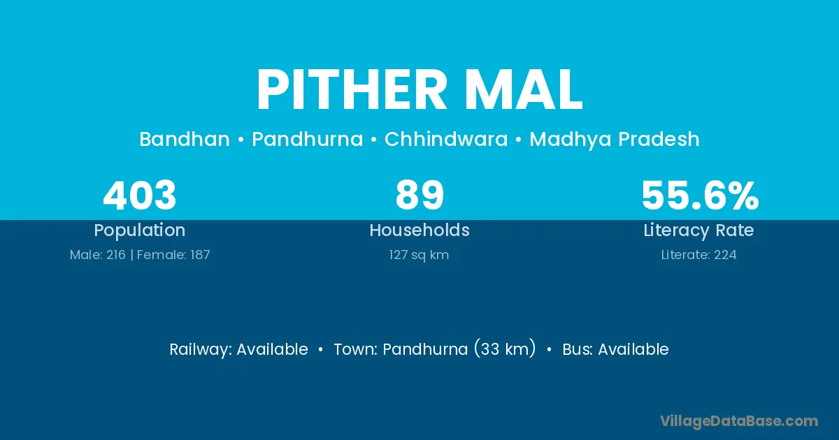 Pandhurna (33 km) is the nearest town to Pither Mal village for major economic activities and is located approximately 33 km away.