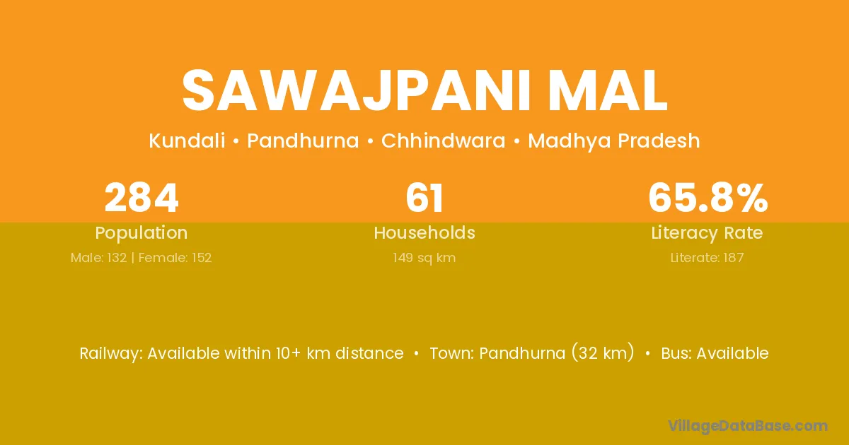 Pandhurna (32 km) is the nearest town to Sawajpani Mal village for major economic activities and is located approximately 32 km away.