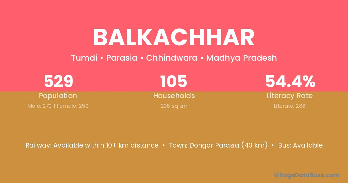 Dongar Parasia (40 km) is the nearest town to Balkachhar village for major economic activities and is located approximately 40 km away.