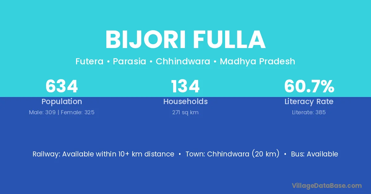Chhindwara (20 km) is the nearest town to Bijori Fulla village for major economic activities and is located approximately 20 km away.