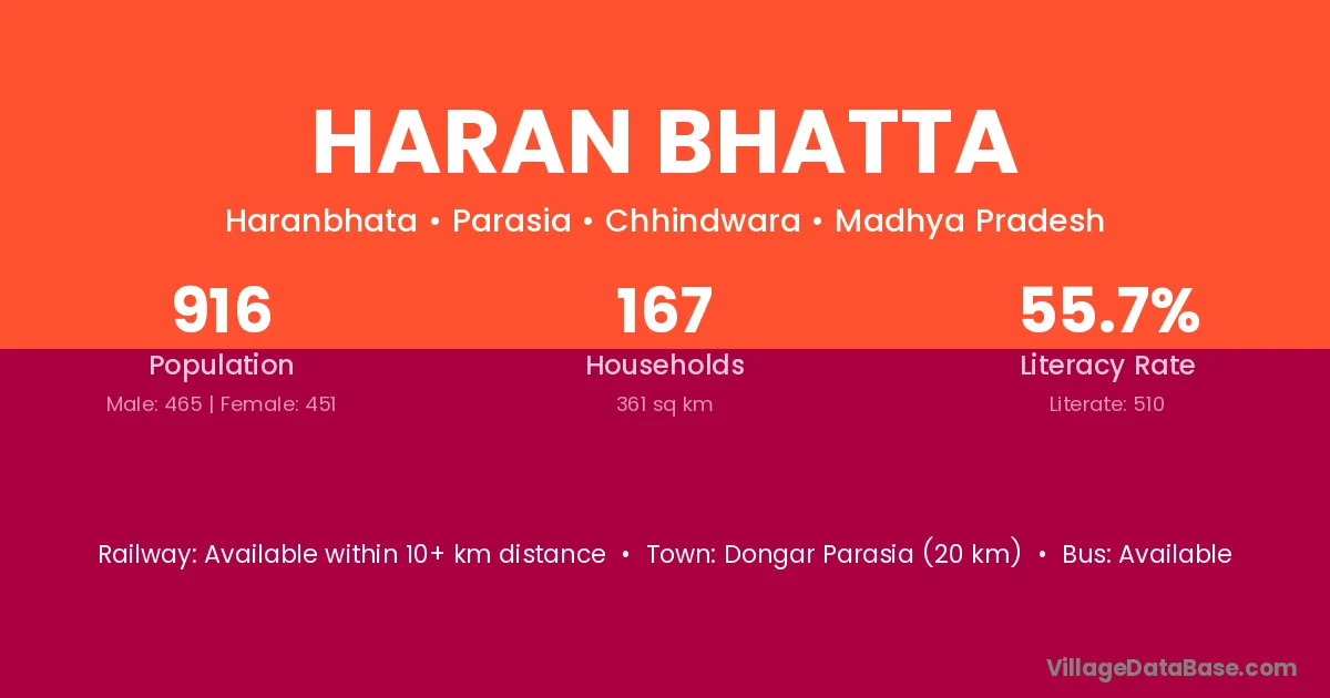 Dongar Parasia (20 km) is the nearest town to Haran Bhatta village for major economic activities and is located approximately 20 km away.