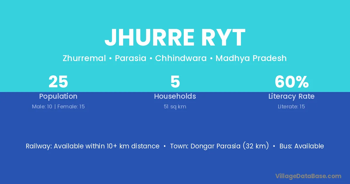 Dongar Parasia (32 km) is the nearest town to Jhurre Ryt village for major economic activities and is located approximately 32 km away.